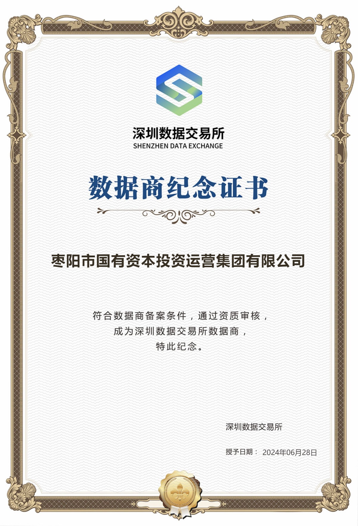 近日,集團(tuán)榮膺深圳數(shù)據(jù)交易所頒發(fā)的“數(shù)據(jù)商紀(jì)念證書”,成為襄陽市首批在深圳數(shù)據(jù)交易所完成認(rèn)證的數(shù)據(jù)商。