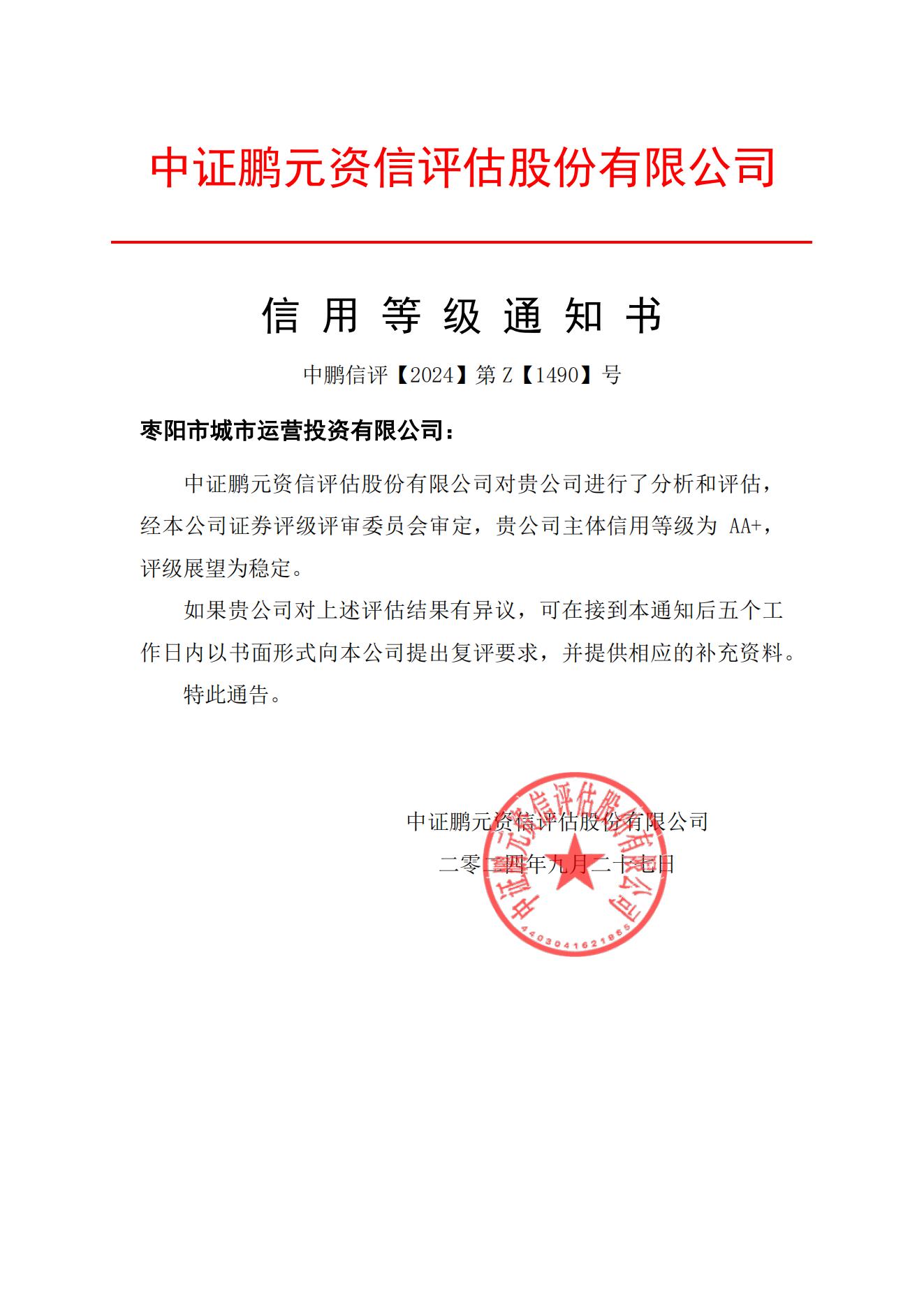 近日,棗陽市城市運營投資有限公司在信用評級領(lǐng)域迎來里程碑式突破,被權(quán)威機構(gòu)中證鵬元資信評估股份有限公司授予“AA+”主體信用等級,成為襄陽市域首家、湖北省內(nèi)第四家獲此殊榮的縣級平臺公司。這一成就不僅彰顯了棗陽城運在全省乃至全國的卓越信用地位,更標(biāo)志著其在區(qū)域經(jīng)濟發(fā)展中的重要角色與貢獻(xiàn)。